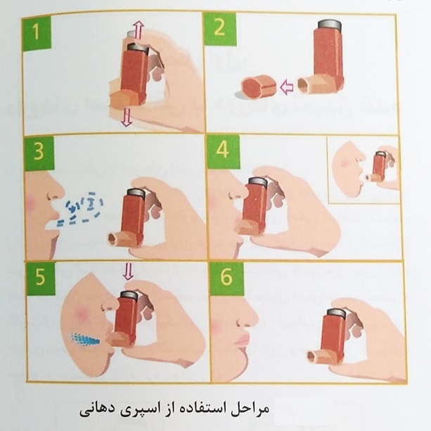 - لبها را آرام دور ﻗﺴﻤﺖ دﻫﺎنی، ﺣﻠﻘـﻪ ﻛﻨﻴﺪ.در ﺣﺎﻟﺖ ﻧﺸﺴﺘﻪ ﻳﺎ اﻳﺴﺘﺎده ﻃﻮرى ﻛﻪ ﺳﺮﺗﺎن را ﺻﺎف و کمی ﺑﻪ ﻋﻘﺐ ﺑﺒﺮﻳﺪ و از راه دﻫﺎن آرام ﻧﻔﺲ ﺑﻜﺸﻴﺪ و اﺳﭙﺮى را ﻳﻜﺒﺎر ﻓﺸﺎر دﻫﻴﺪ ﺗﺎ دارو ﺧﺎرج ﺷﻮد. در ﻫﻤﻴﻦ ﻫﻨﮕﺎم ﺑﻪ آرامی و ﻋﻤﻴﻖ ﻧﻔﺲ ﺑﻜﺸﻴﺪ. ﺗﺎ دارو ﺑﻪ رﻳﻪ ﻫﺎى ﺷﻤﺎ ﺑﺮﺳﺪ.