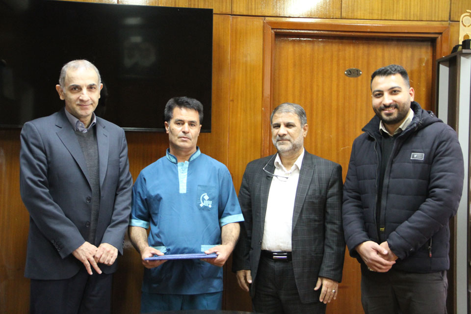 و دکتر محمد تقی طالبیان، رئیس بیمارستان سینا با حضورمهندس هادی مخبر، مشاور رئیس بیمارستان سینا و حسن بیگدلی، مسئول خدمات در نشستی با اهدای لوح تقدیر و کارت هدیه مهر تاییدی بر جوانمردی او زدند.